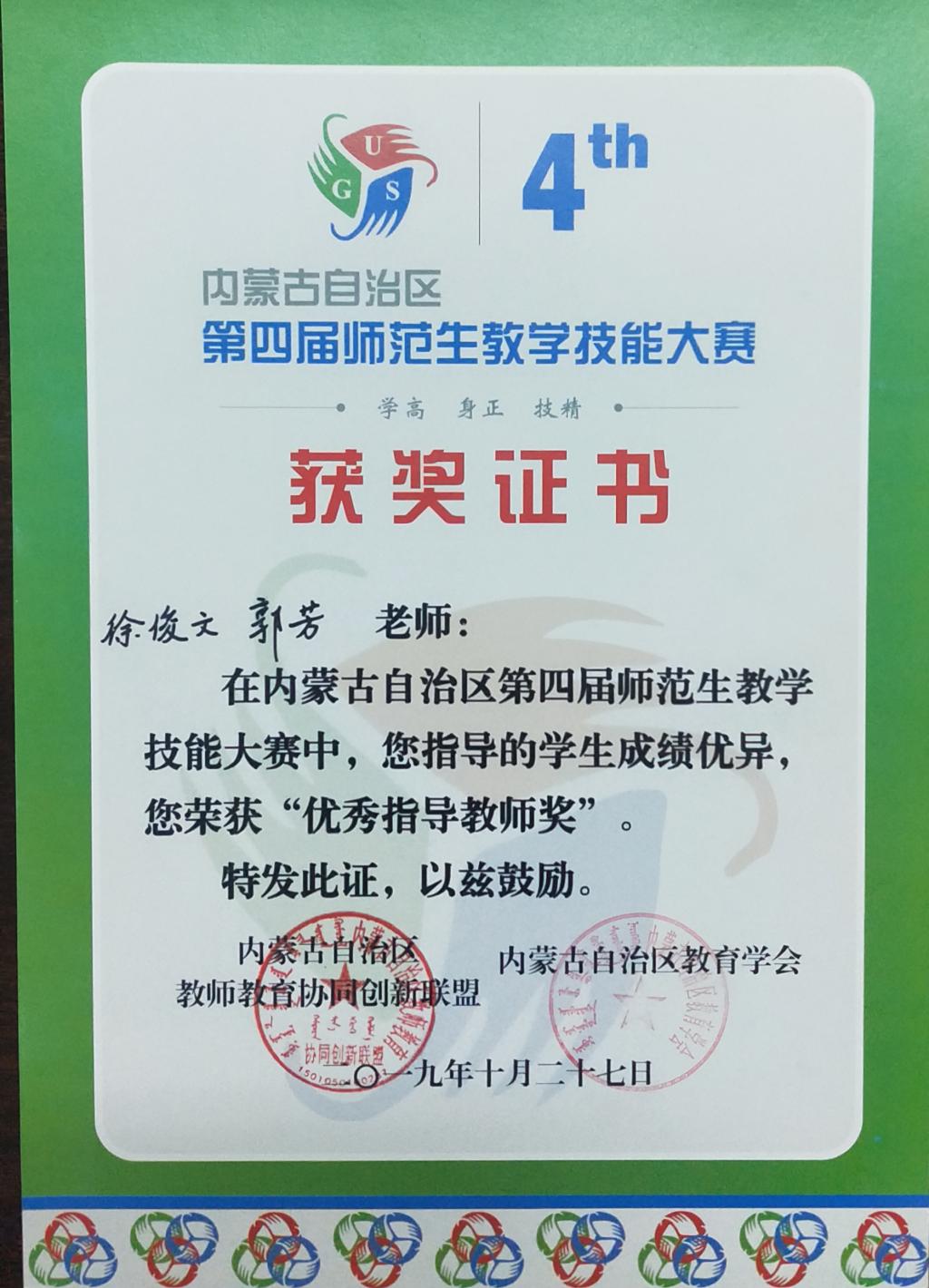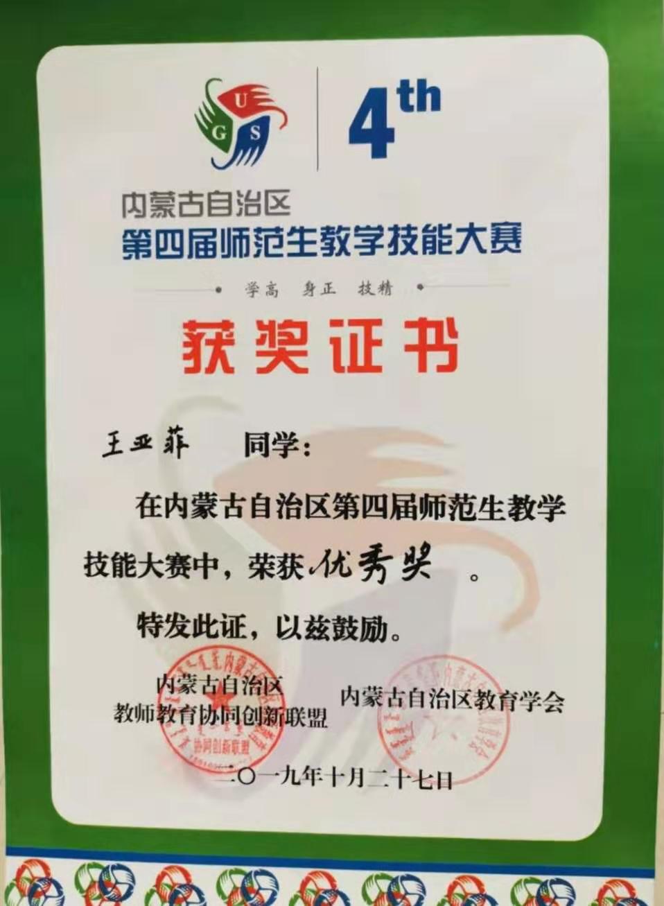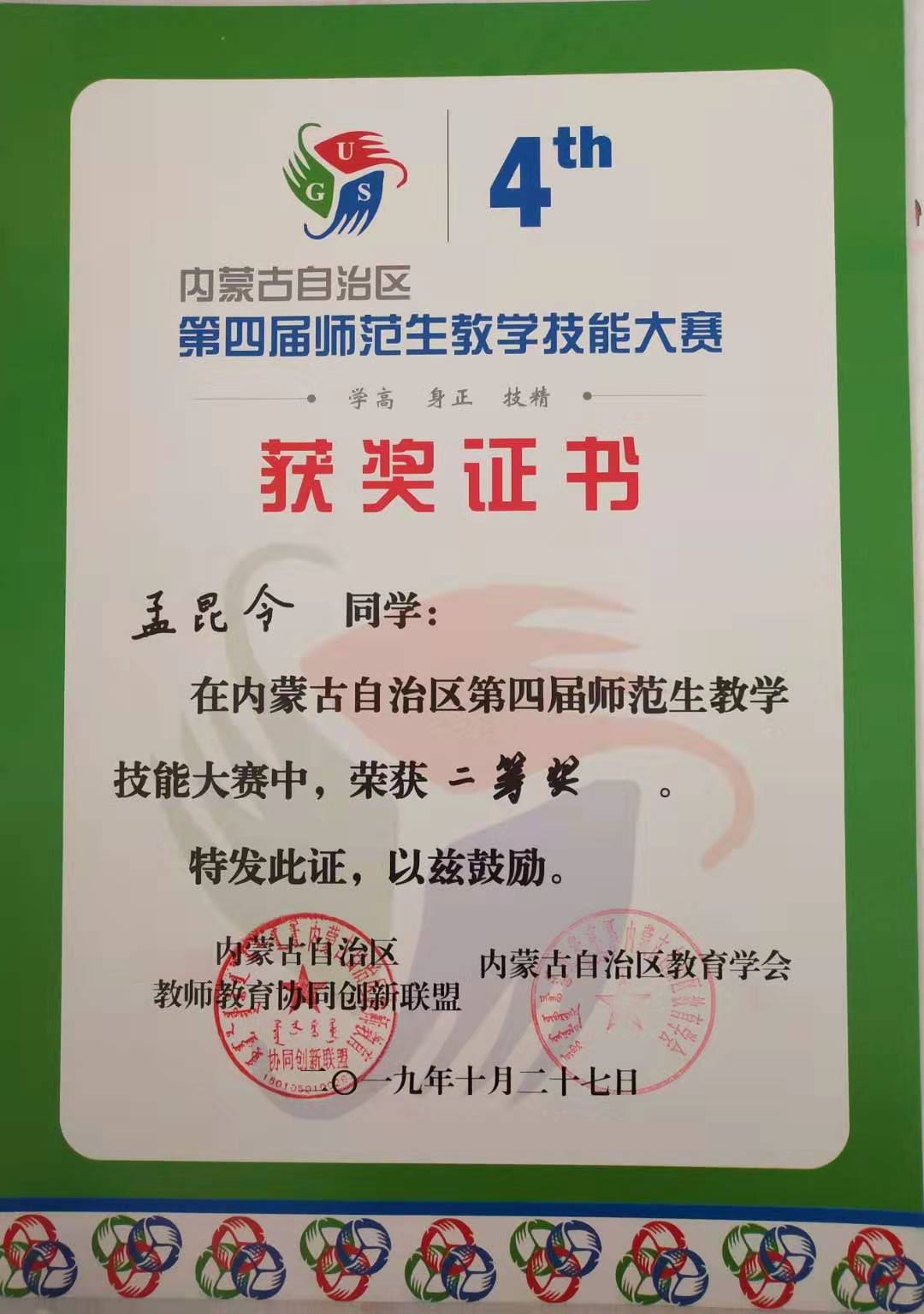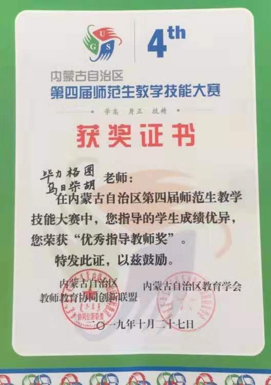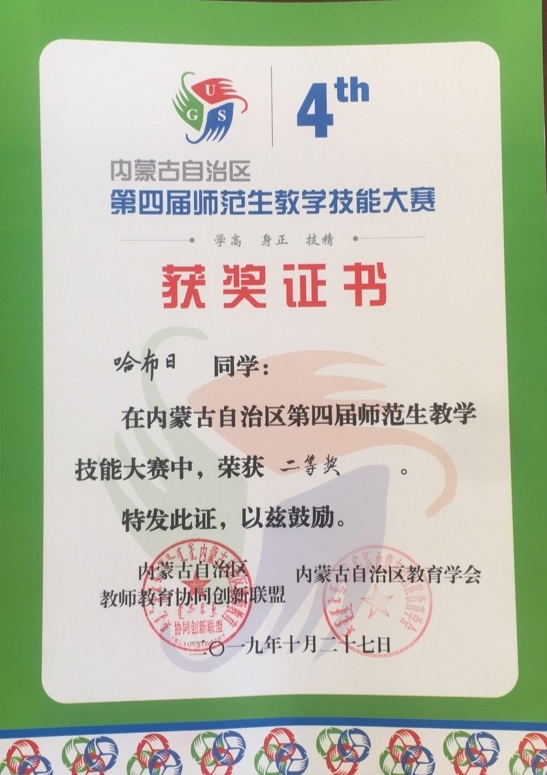 经过几个环节的激烈比拼,我院取得优异的成绩,荣获永利官网优秀指导教师的有毕力格图老师、乌日柴胡老师、徐俊文老师、郭芳老师;尼日嘎拉同学获得数学与应用数学(蒙古语)组一等奖,哈布日同学获得数学与应用数学(蒙古语)组二等奖,孟昆令同学获得数学与应用数学(汉语)组二等奖,王亚菲同学获得数学与应用数学(汉语)组优秀奖。