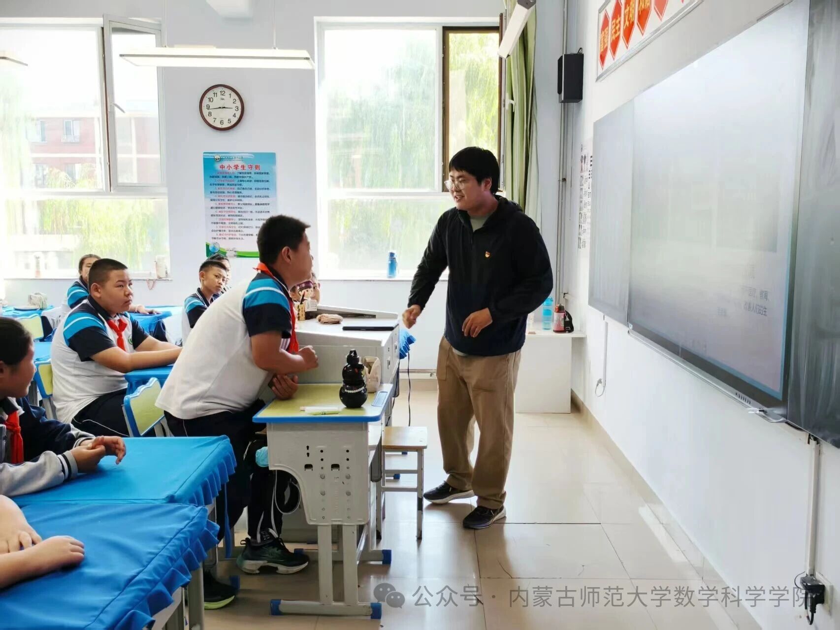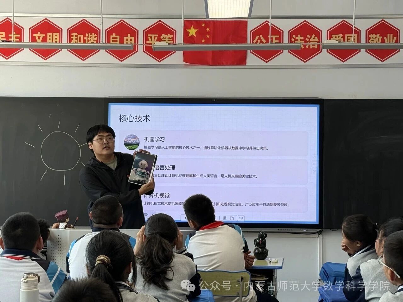 在和林格尔县乳业开发区第一小学,内蒙古科学技术普及学会兼职副秘书长、yl6809永利检测中心博士研究生乌日乐等一群研究生科普志愿者,他们用所学的“数据科学与智能信息处理”“基础数学”“应用数学”等学科专业,用通俗易懂的语言,为小学生普及“人工智能是什么”“人工智能会做什么”“机器是怎样看懂图像的”,通过活动让学生积极体验,在活动中感知科技、思考未来、收获新知。