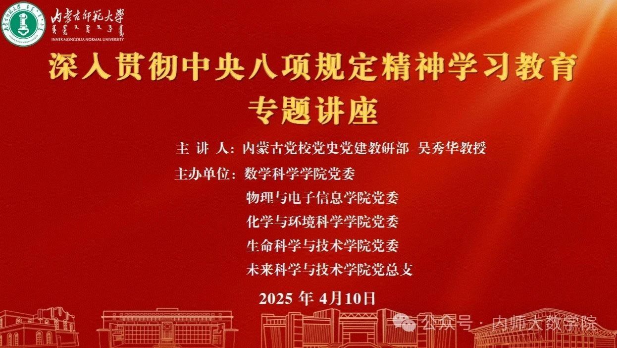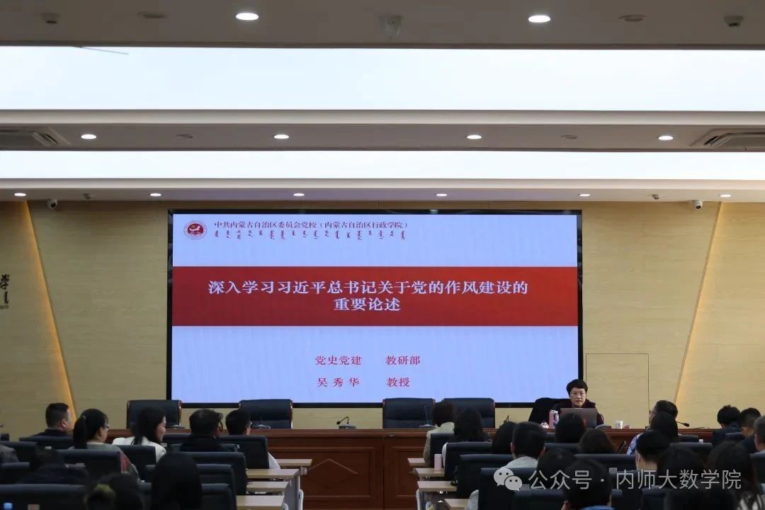 为深入贯彻落实党中央、自治区党委、学校党委深入贯彻中央八项规定精神学习教育精神和要求,高质量开展学习教育活动,4月10日,我院联合化学与环境科学学院、物理与电子信息学院、生命科学与技术学院和未来科学与技术学院在赛罕校区行政楼三楼报告厅举办深入贯彻中央八项规定精神学习教育读书班专题讲座。讲座邀请内蒙古党校党史党建教研部吴秀华教授作题为“深入学习习近平总书记关于党的作风建设的重要论述”专题讲座。
