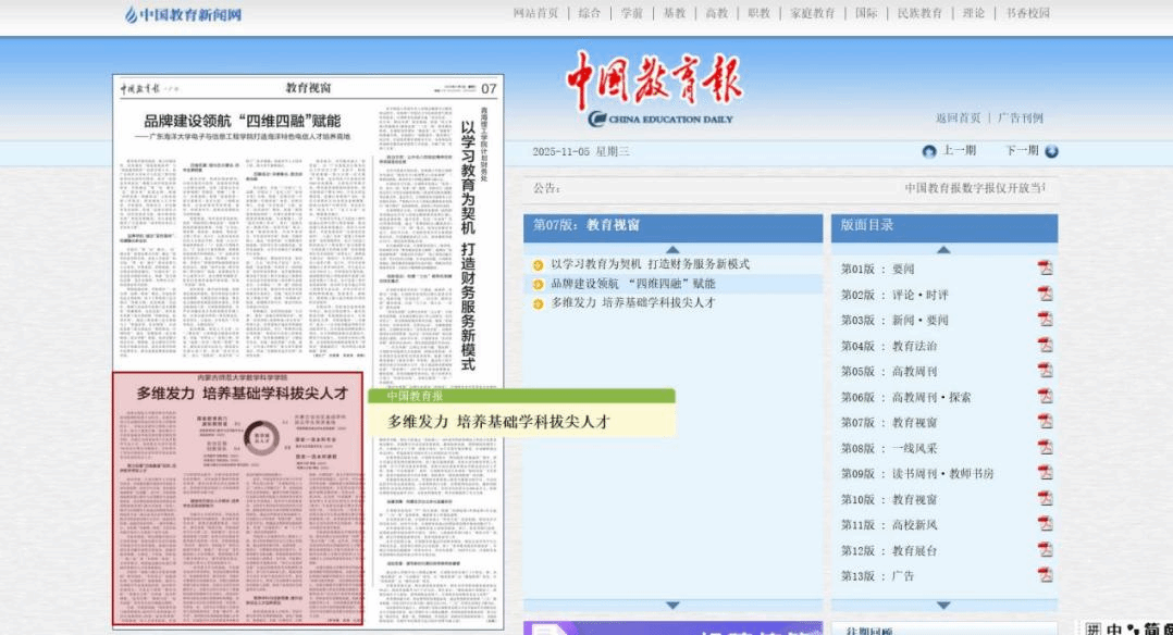 《中国教育报》2025年11月5日第07版教育视窗,以”多维发力 培养基础学科拔尖人才“为题报道yl6809永利检测中心基础学科拔尖人才培养工作成效。全文链接:http://paper.jyb.cn/zgjyb/h5/html5/2025-11/05/node_1.htm?v=1&curr=6