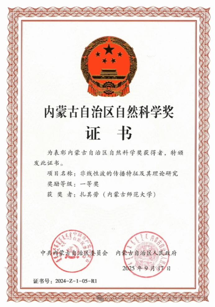 近日,内蒙古自治区科学技术奖励大会在呼和浩特市隆重召开。大会表彰了为全区科技进步和高质量发展作出突出贡献的科技工作者和科研团队。yl6809永利检测中心院长扎其劳教授团队牵头的《非线性波的传播特征及其理论研究》荣获2024年度自治区自然科学奖一等奖。