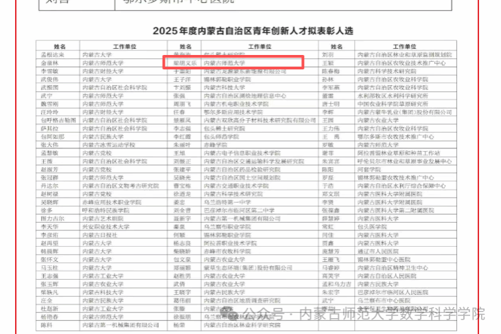 近日,2025年度内蒙古自治区青年创新人才拟表彰人选名单正式公示,我院梁胡义乐老师凭借突出的创新能力与扎实的工作成效光荣入选!
