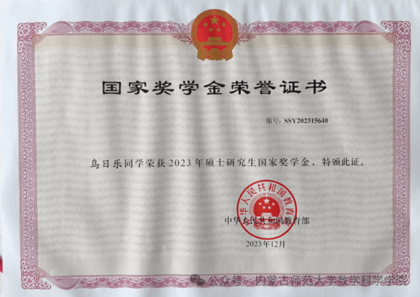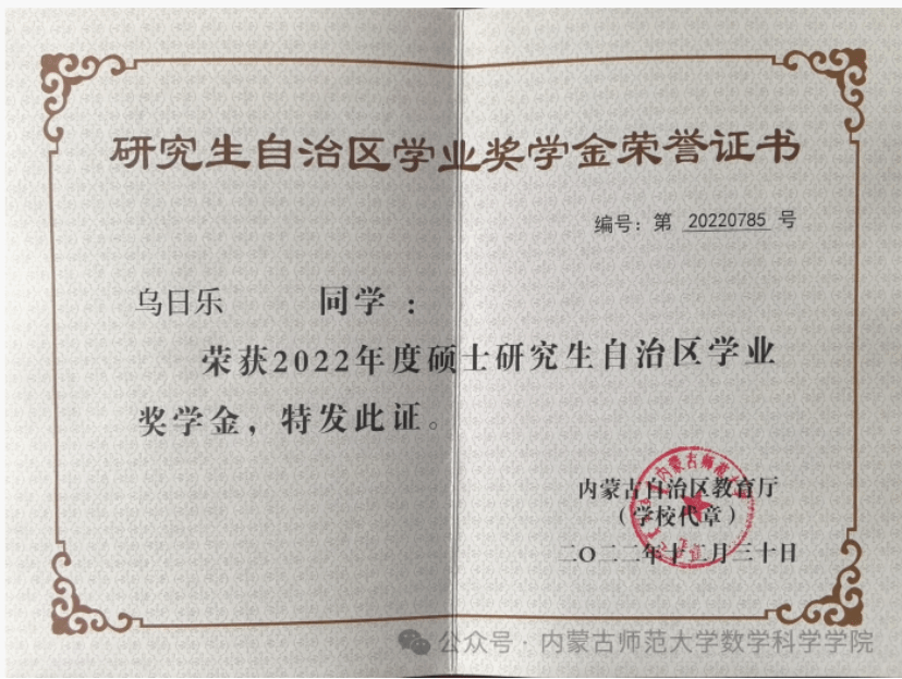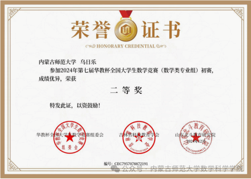在深耕科研的同时,乌日乐注重理论与实践融合,主动投身高水平学科竞赛,以赛促学、以赛提能。先后获得第十届“数维杯”国际大学生数学建模挑战赛一等奖、第七届“华教杯”全国大学生数学竞赛(数学类专业组)初赛二等奖,展现出扎实的学科素养和创新能力。