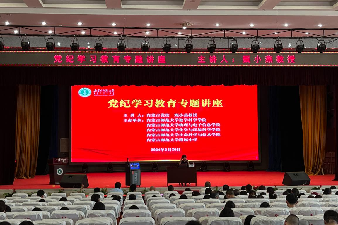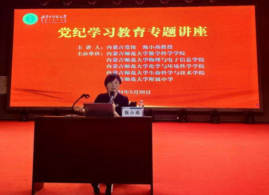 为深入学习贯彻习近平总书记关于全面加强党的纪律建设的重要论述和关于党纪学习教育的重要讲话重要指示精神,认真学习领会新修订的《中国共产党纪律处分条例》,进一步加强我院师生党员的党性修养与政治素质,5月30日下午,我院联合物理与电子信息学院、化学与环境科学学院、生命科学与技术学院和附属中学在附属中学共同举办了党纪学习教育专题讲座。讲座特邀内蒙古党校党史党建教研部甄小燕教授作题为“深入学习贯彻《中国共产党纪律处分条例》”的专题辅导报告,学院全体教工党员和部分学生党员参加学习。