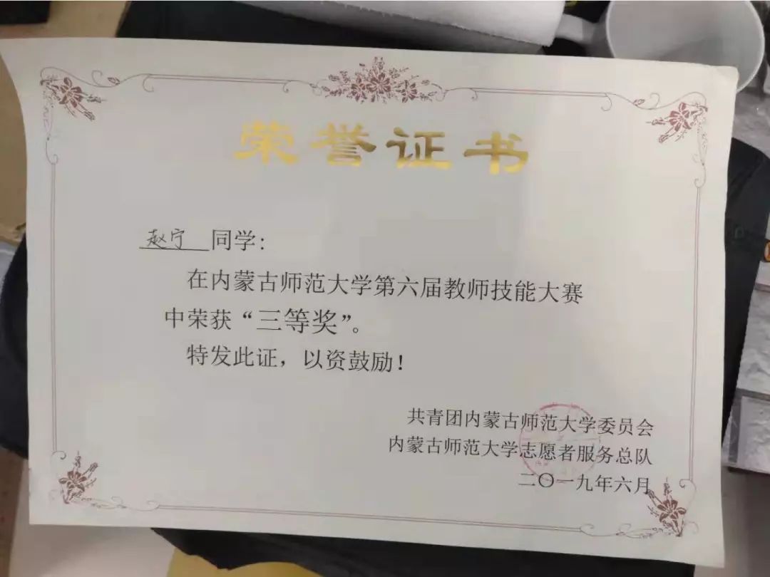 17级数学与应用数学汉二班学生,2019年荣获内蒙古自治区第四届师范生教学技能大赛数学与应用数学(汉语)组二等奖。