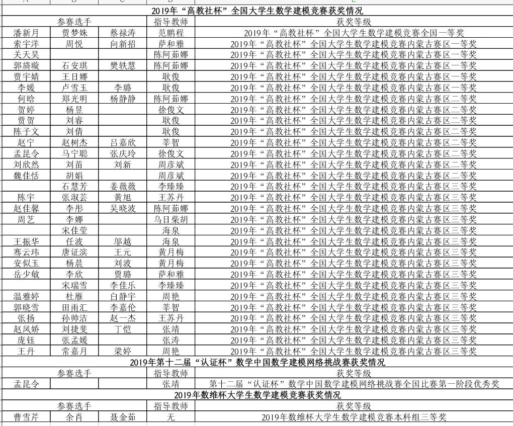 2019年我院学生积极参与各类数学建模竞赛,并屡获佳绩,其中在2019“高教社杯”全国大学生数学建模竞赛中,由我院2017级潘新月、贾梦姝、蔡禄涛三位同学组成,范鹏程老师指导的队获得2019年全国大学生数学建模竞赛全国一等奖。这是我校首次获得该项比赛全国一等奖,也是全区高校在本次比赛中获得的唯一一等奖,另有5个队获得内蒙古自治区赛区一等奖,8个队获得赛区二等奖,16个队获得赛区三等奖;在2019第十二届“认证杯”数学中国数学建模网络挑战赛中1队获得全国比赛第一阶段优秀奖;在2019数维杯大学生数学建模竞赛中1队获得本科组三等奖。