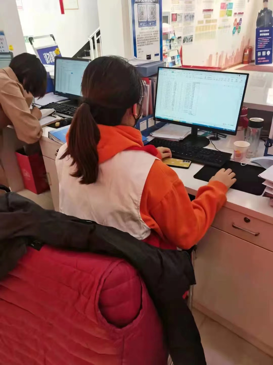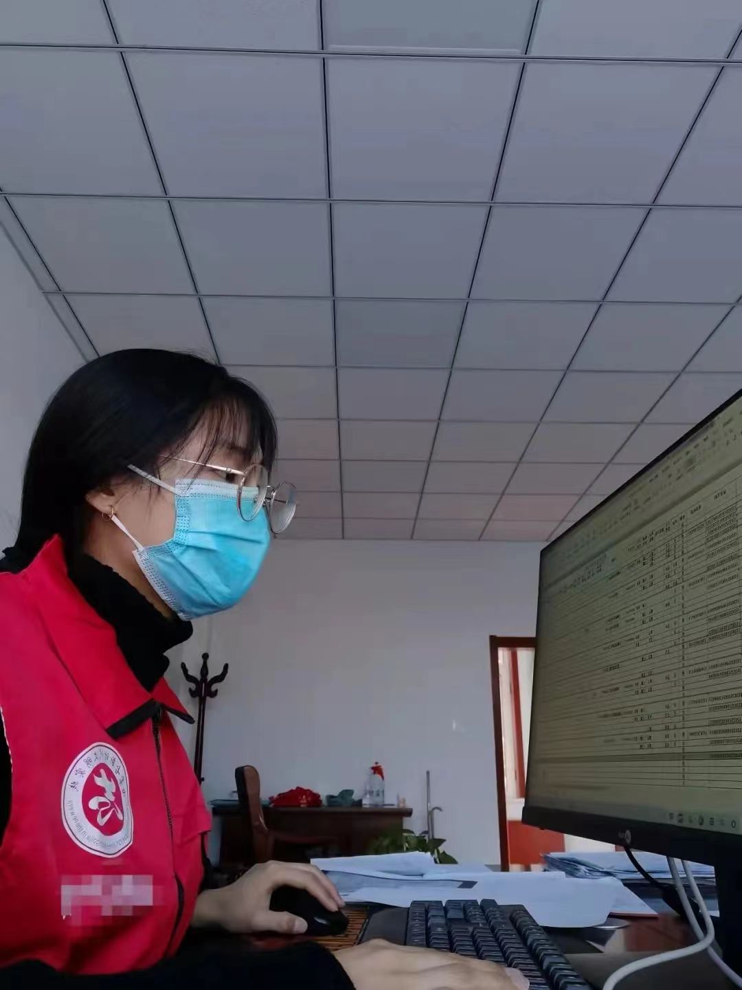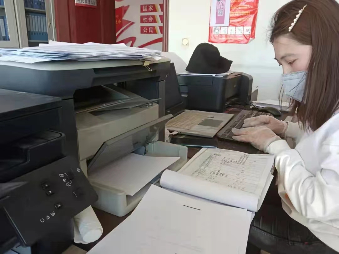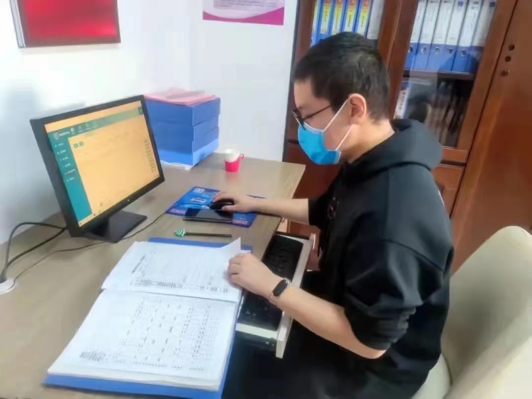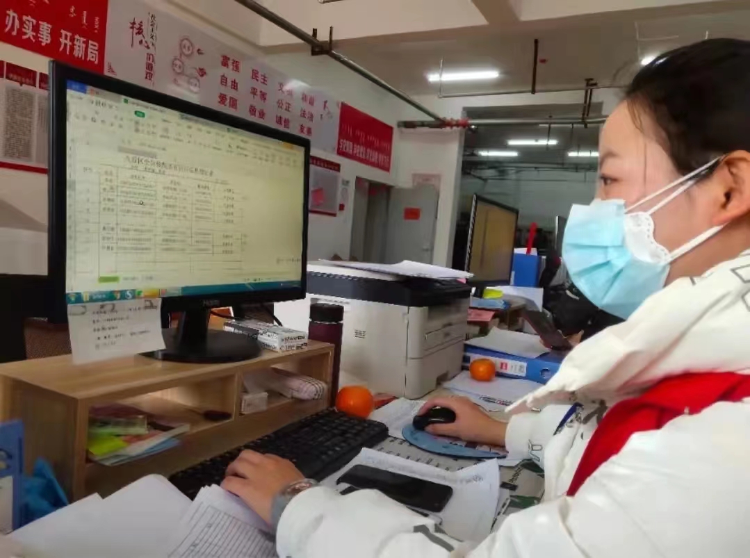 电脑核对打电话并督促未接种新冠疫苗第三针加强针居民接种,对从中高风险地区返乡人员,督促及时报备,做好双采等