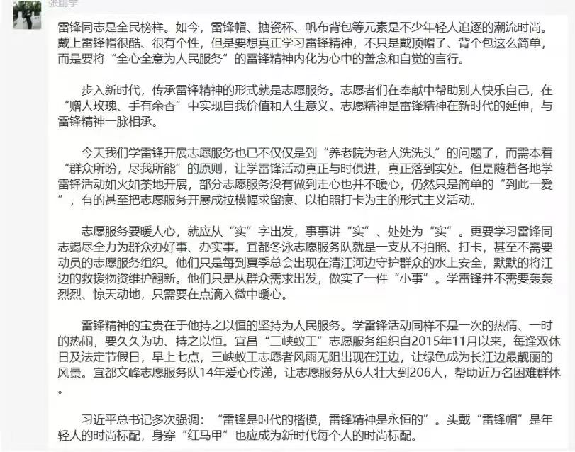 雷锋是一个时代的楷模,雷锋精神是永恒的。实现中华民族伟大复兴,要不断闯关夺隘,也需要更多的时代楷模。我们要见贤思齐,把雷锋精神代代传承下去。