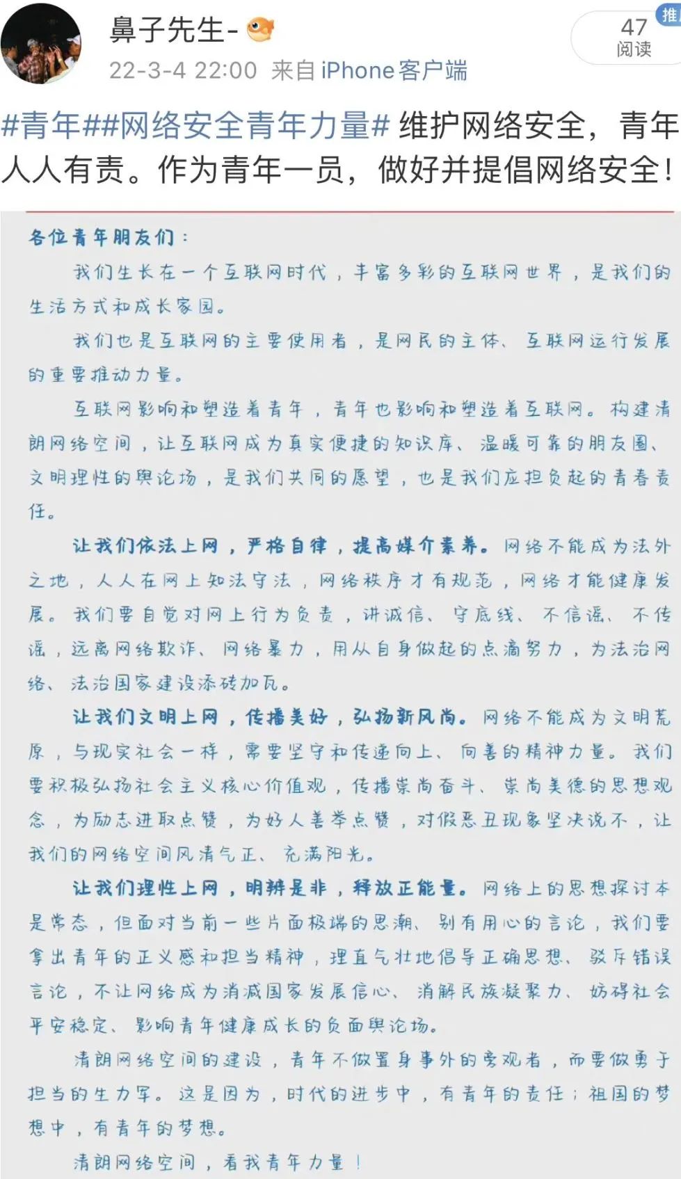 "清朗网络空间的建设,青年不做置身事外的旁观者,而要做勇于担当的生力军。这是因为,时代的进步中,有青年的责任;祖国的梦想中,有青年的梦想。清朗网络空间,看我青年力量!"