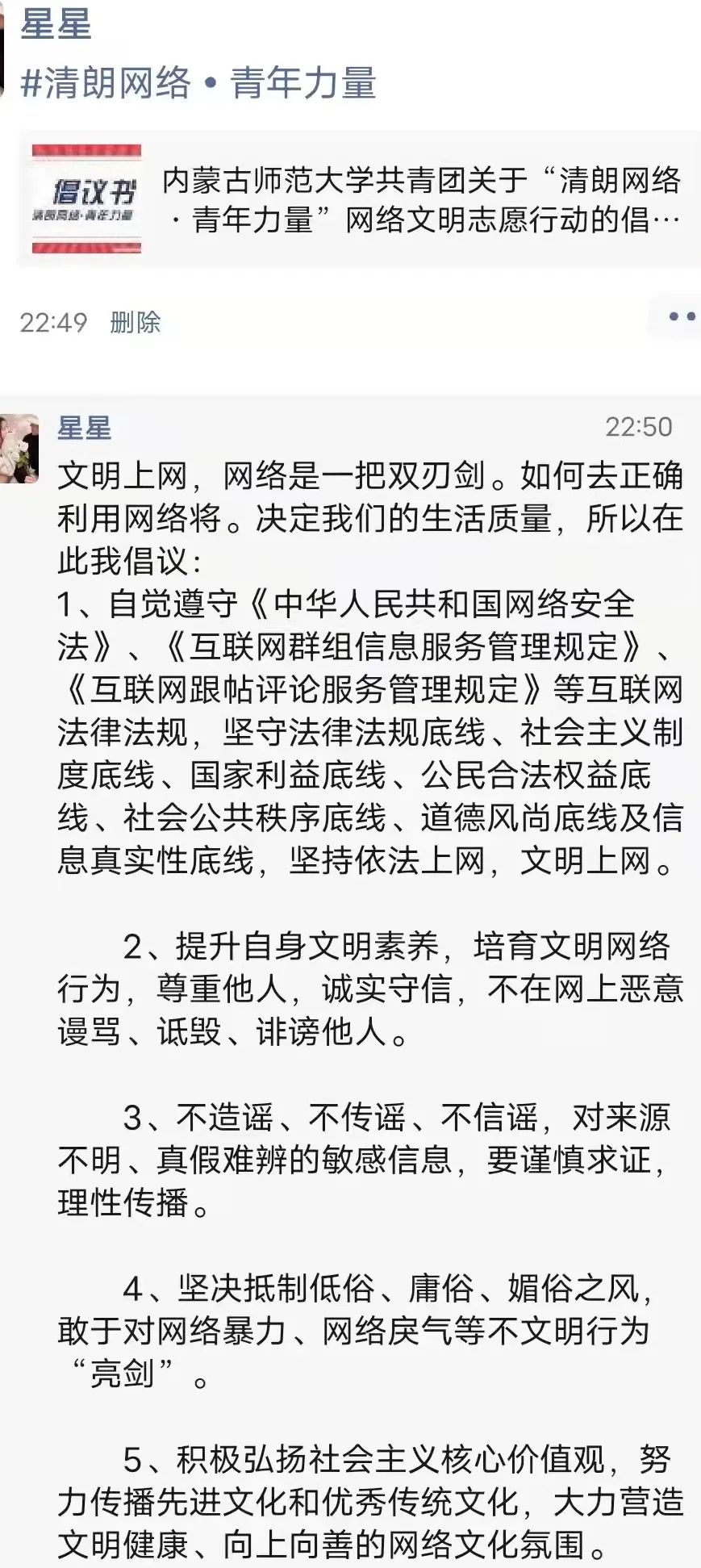 为进一步贯彻落实习近平总书记和党中央的重要要求,动员广大团员青年积极参与构建清朗网络空间,yl6809永利检测中心组织各班进行了“清朗网络,青年力量”主题活动,号召大家积极按照习近平总书记提出的“勤学、修德、明辨、笃实”要求,将共青团员的先进性和担当精神延伸到网上,在网上积极发出青年好声音、形成强劲青春正能量。