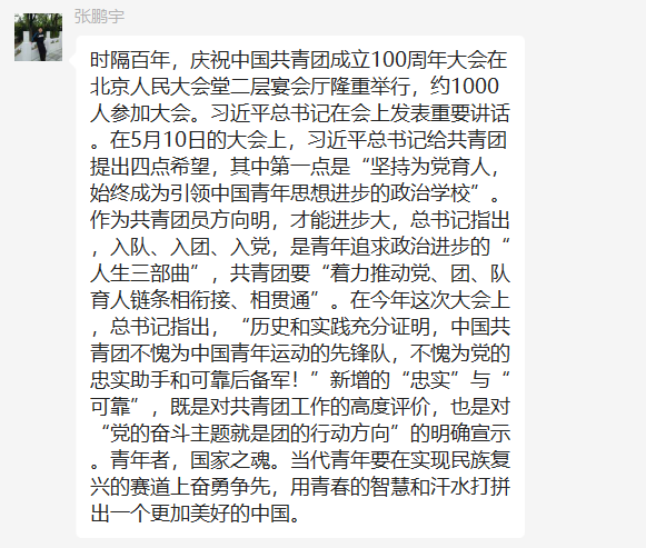 青春孕育无限希望,青年创造美好明天。习近平总书记在此次大会上讲道:“历史和实践充分证明,中国共青团不愧为中国青年的先锋队,不愧为党的忠实助手和可靠后备军”。生逢其时,也应重任在肩。作为新时代新青年,作为中国薪火的赓续者,拥有人生最宝贵的青春,易被时代感染,亦无惧迈上征程,能扛时代大旗,能“教日月换新天”,终将在新时代背景下乘风破浪,浩荡千里。今日党对青年寄予深切希望,未来青年定会在光辉历程中谱写新的篇章!