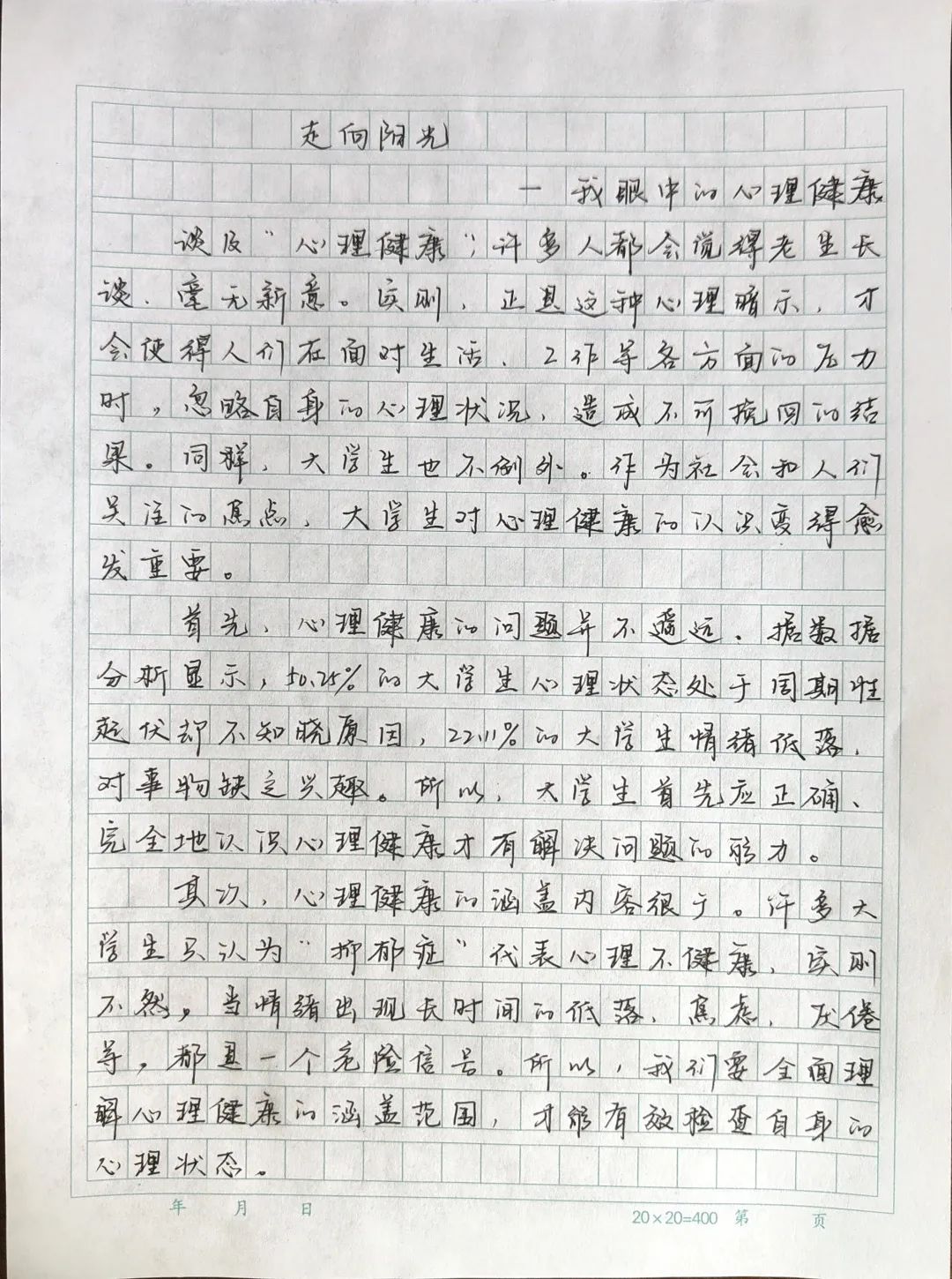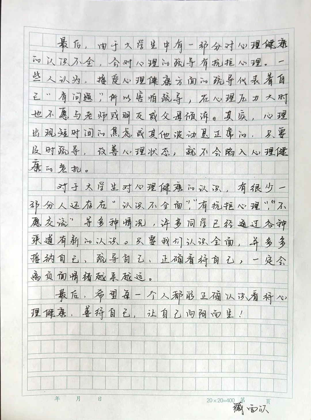 为提升心理育人质量,增强大学生心理调适能力,我院开展了“我爱我”心理健康征文活动。此次征文活动共86人参加,同学们从个人成长经历分享(自己的心理变化以及相关的收获或感悟)、我眼中的心理健康(谈及大学生对心理健康的认识)、我与心理健康(自己参与过的心理健康活动相关的经历)等方面,通过用笔端的表达方式,抒发了自己对心理健康的见解,以下是部分文章: