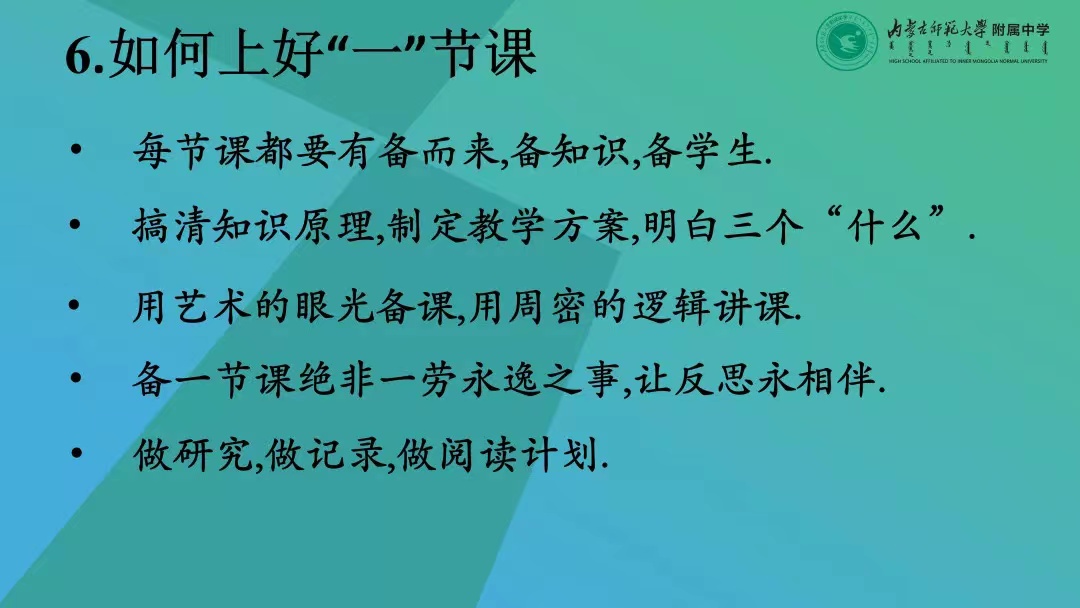 案例分析后,张生老师总结出年轻教师如何上好“一节课”所必须遵循的5条原则,人无完人,课无完课,我们应该要有用一辈子备课的精神。虽然我们青年教师尚且达不到这种境界,但是,我们应该心中有理想、有态度、有责任和追求,不断打磨自己的课堂,向着心中的“艺术品”靠近!