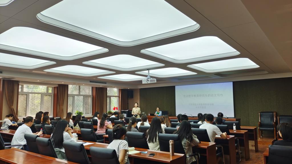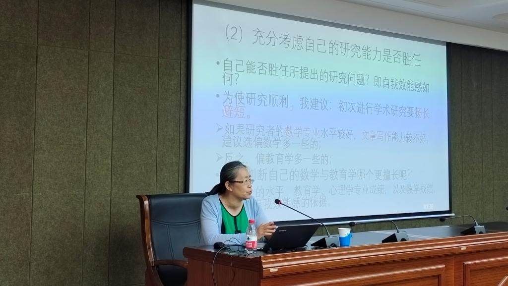 6月18日,我院特邀中国教育学会中学数学教学专业委员会副理事长、学术委员会副主任、北京师范大学博士生导师朱文芳教授作了题为“浅谈数学教育研究生的论文写作”的学术讲座。讲座由我院李春兰教授主持,参加本次讲座的主要有我院领导、老师、数学教育方向的硕士研究生、硕士研究生实践导师、其他学院的师生。