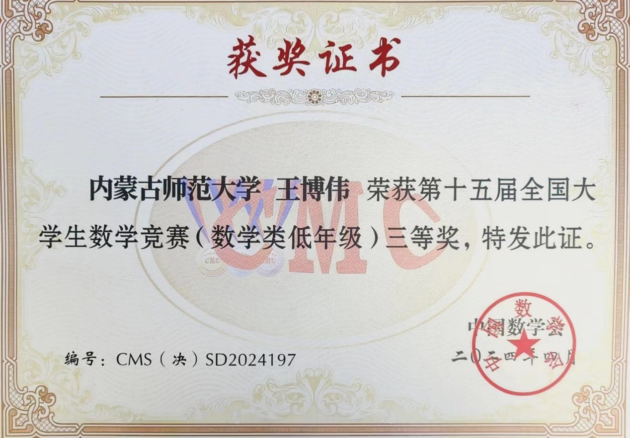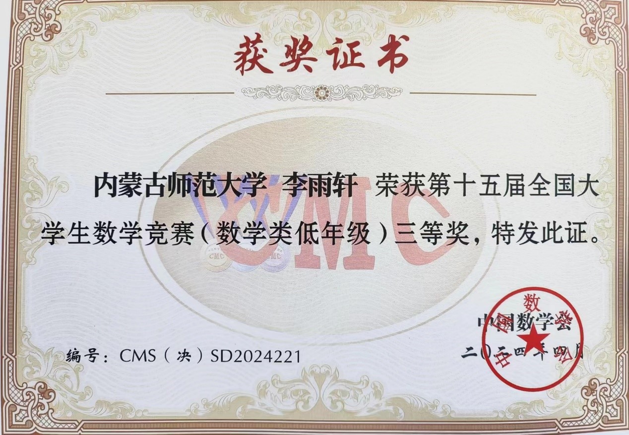 近日,第十五届全国大学生数学竞赛决赛在山东大学中心校区落下帷幕。这场数学界的“奥林匹克”盛会,吸引了全国众多顶尖学府的精英学子们共同角逐数学领域的桂冠。本次比赛规模空前,共有1169名来自全国各赛区的优秀学生成功入围决赛,人数创历届赛事之最。我校yl6809永利检测中心2022级学生王博伟、李雨轩、王建一在内蒙古赛区初赛中,以优异的成绩脱颖而出,成功闯入决赛。3位学生在带队导师陈阿茹娜和教师李璐的带领下,顺利参加决赛。经历了紧致而激烈的角逐,王博伟和李雨轩2位学生取得了决赛数学类(低年级组)三等奖的良好成绩。