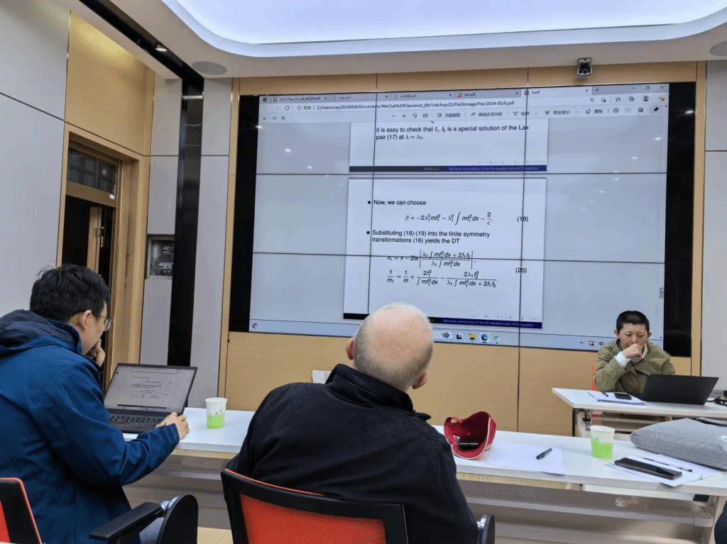 座谈会上,首先由我院教师和博士研究生介绍可积系统团队的研究基础和近期研究工作,然后两位专家就团队已有的研究工作以及未来的研究方向给出了指导意见。最后,两位专家对各自的研究方向进行了细致的阐述,双方就合作的切入点及突破口进行了热烈的讨论。