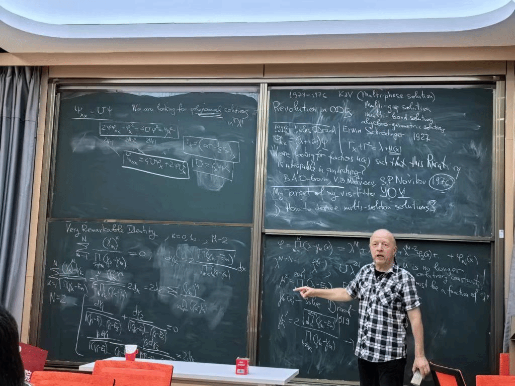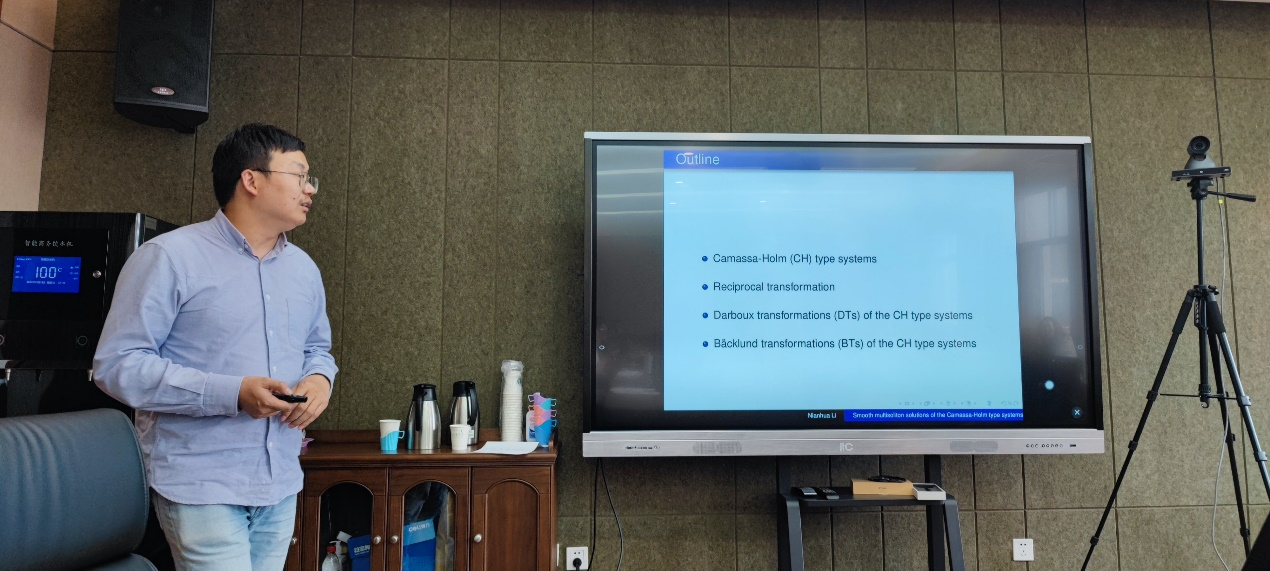 Pavlov教授在报告中首先构造了二阶ODE的一般解,然后引入特征参数,构造了KdV方程和耦合KdV方程的多相位解。李年华教授基于Reciprocal变换构造了Camassa-Holm类型方程的Darboux变换及多孤子解。