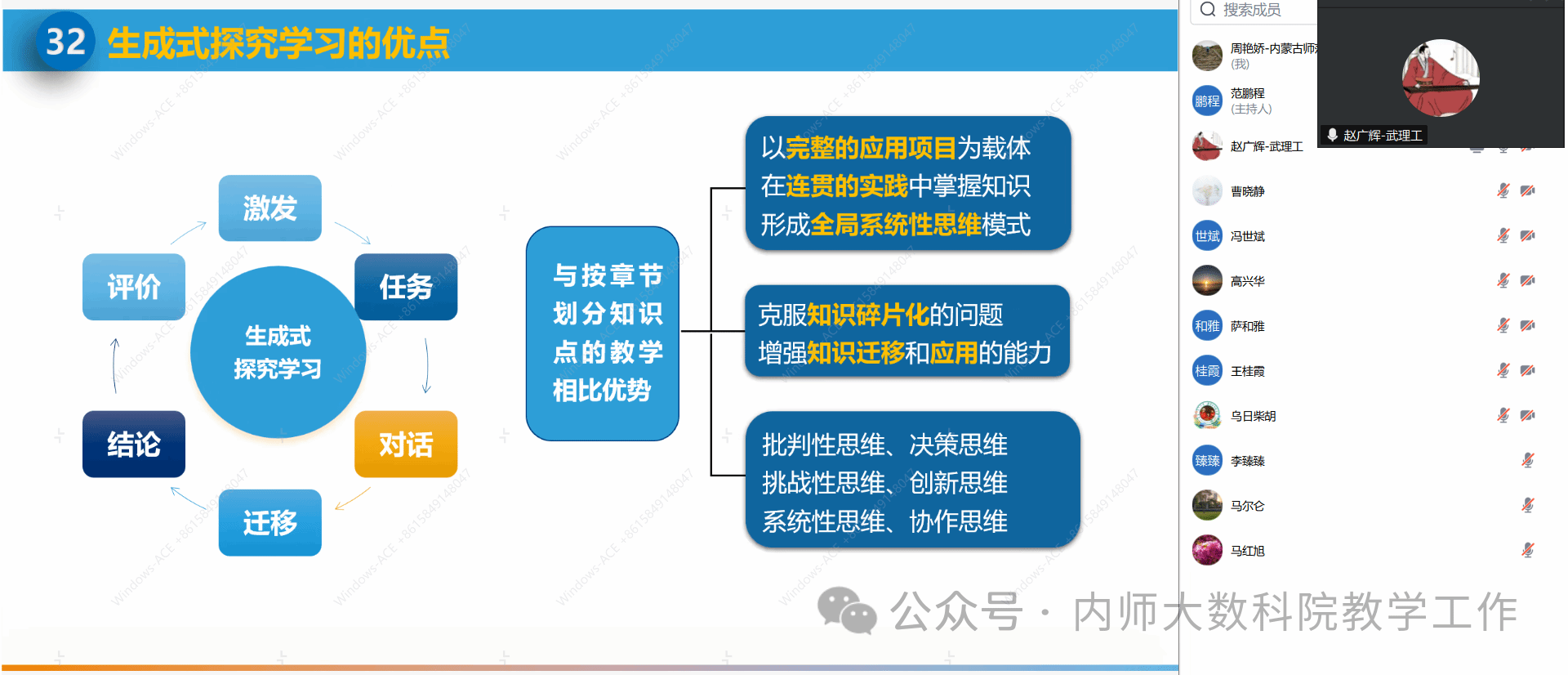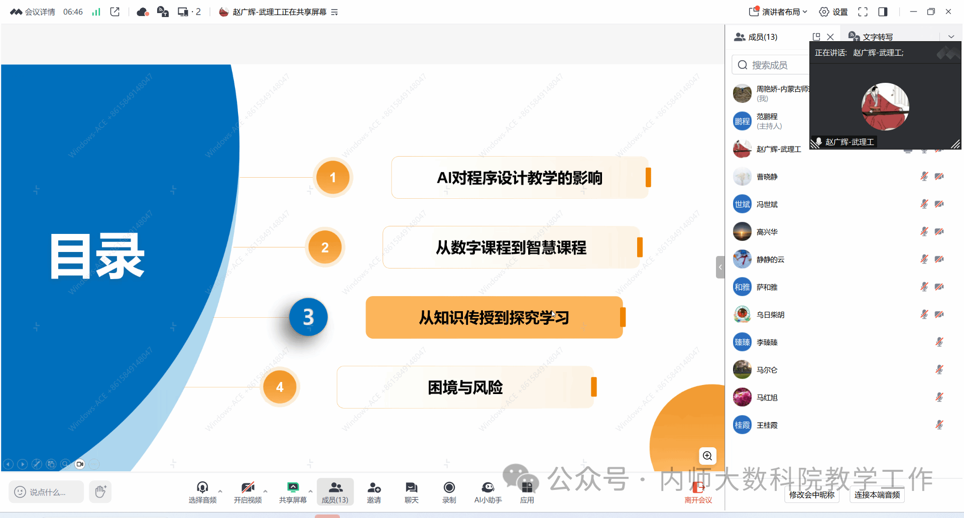 4月22日晚上7点半,yl6809永利检测中心在线上举办了题为“大模型时代Python程序设计智慧课程建设与教学变革”的专题讲座,本次讲座邀请了武汉理工大学赵广辉教授主讲。会议由信息与计算科学系系主任范鹏程老师主持,萨和雅院长、数学系系主任乌日柴胡以及我院20余名教师共同参与了此次会议。