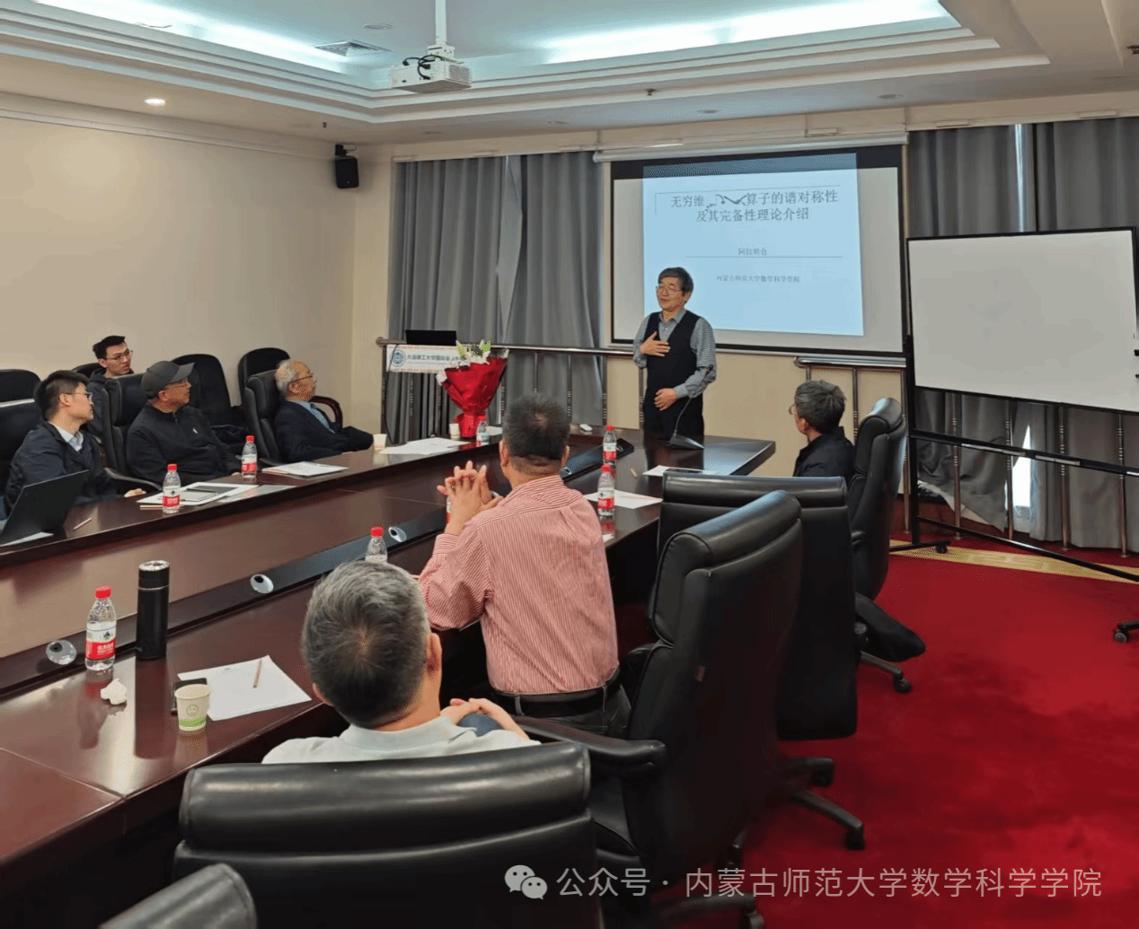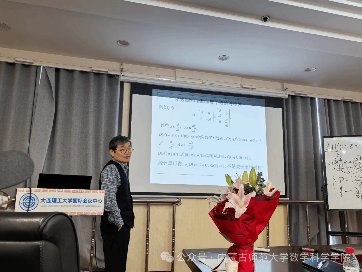 2025年5月16日,无穷维哈密顿系统及其算法应用教育部重点实验室主任阿拉坦仓教授应大连理工大学yl6809永利检测中心邀请,在可积系统与数学机械化研讨会上作题为“无穷维Hamilton算子的谱对称及其完备性介绍”的学术报告。