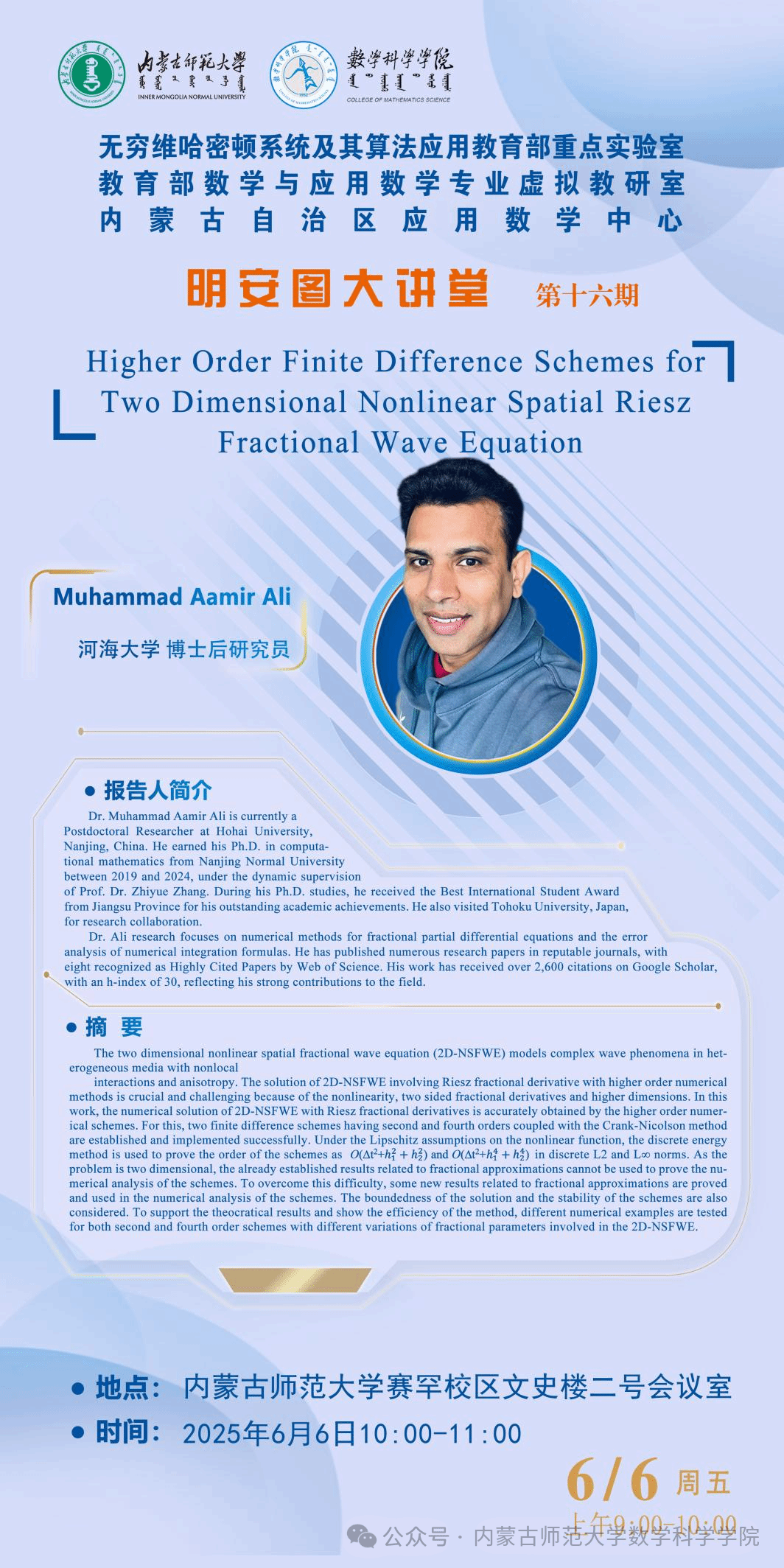 6月6日,yl6809永利检测中心明安图大讲堂在永利官网赛罕校区文史楼2号会议室成功举办。本次讲座特邀南京师范大学张志跃教授与河海大学博士后研究员ALI作专题学术报告。两场报告分别聚焦深度学习求解界面问题与分数阶微分方程的高精度数值方法,现场互动热烈。