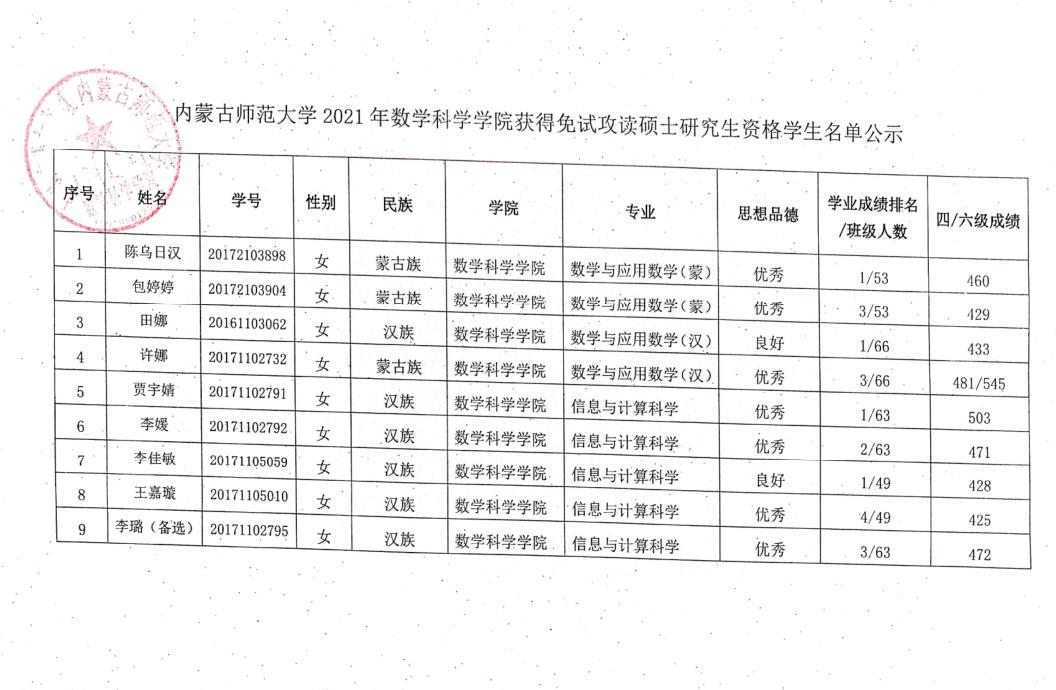 为保障推荐优秀应届本科毕业生免试攻读硕士学位研究生(以下简称推免生)工作的顺利发展,促进本科教学质量的提高,根据《永利官网推荐优秀应届本科毕业生免试攻读硕士学位研究生工作实施办法》文件精神,结合学院实际,通过yl6809永利检测中心2021年优秀应届本科毕业生推荐免试攻读硕士学位领导小组工作(以下简称推免工作)会议,评选出了获得2021年yl6809永利检测中心推荐免试攻读硕士研究生资格的学生及预备推荐免试攻读硕士研究生资格学生名单。现对推免工作领导小组成员、获得2021年yl6809永利检测中心获得推荐免试攻读硕士研究生资格学生(预备推荐学生)名单进行公示,具体内容请见附件!